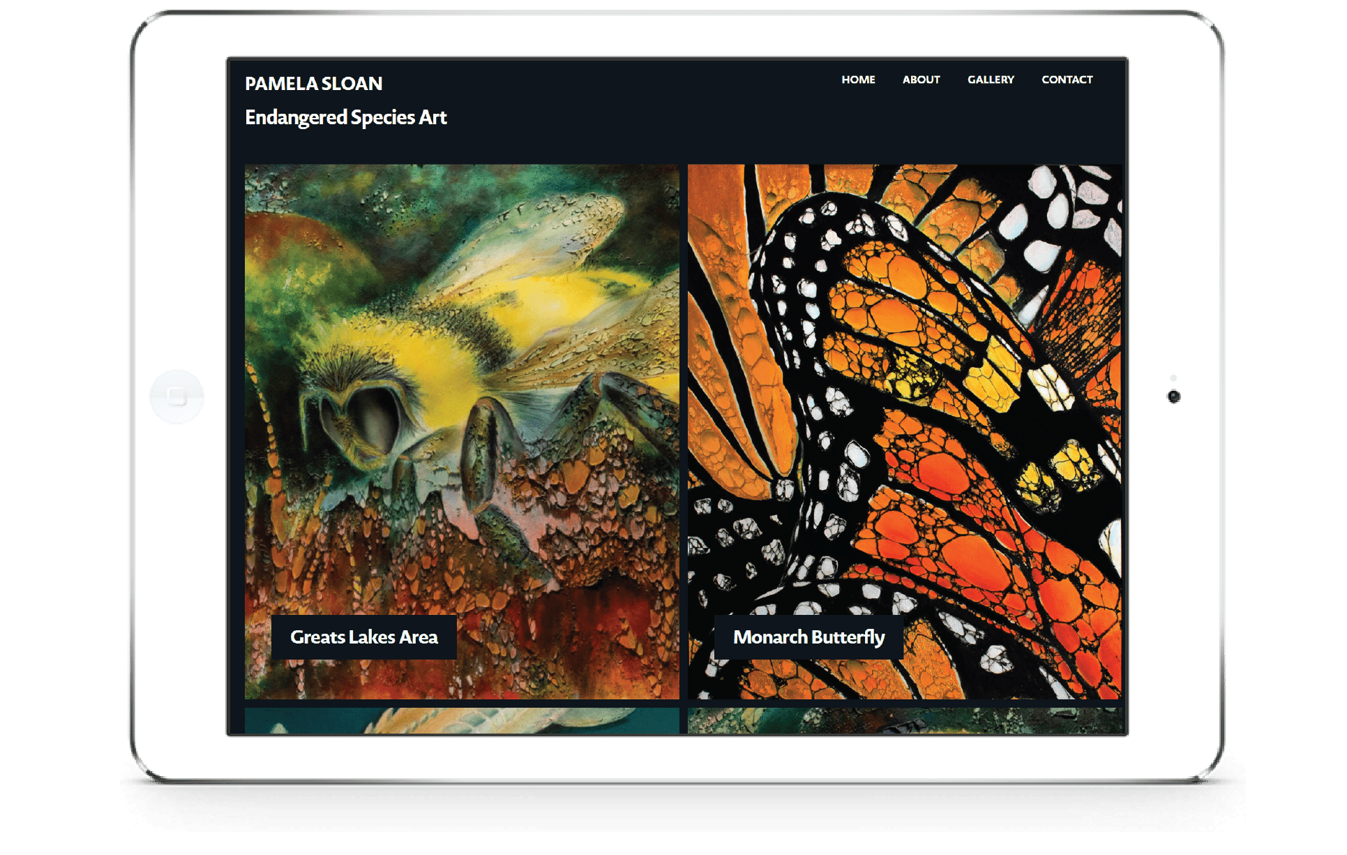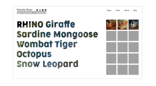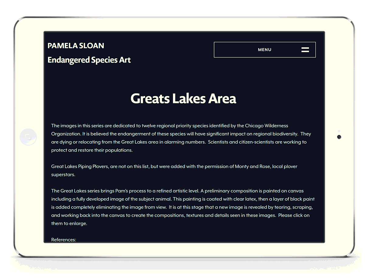 Pam asked me to help her create a website that showcases her beautiful artwork, leans into her mixed-media layering collage/painting technique, and helps to promote awareness of habitat and species endangement.
