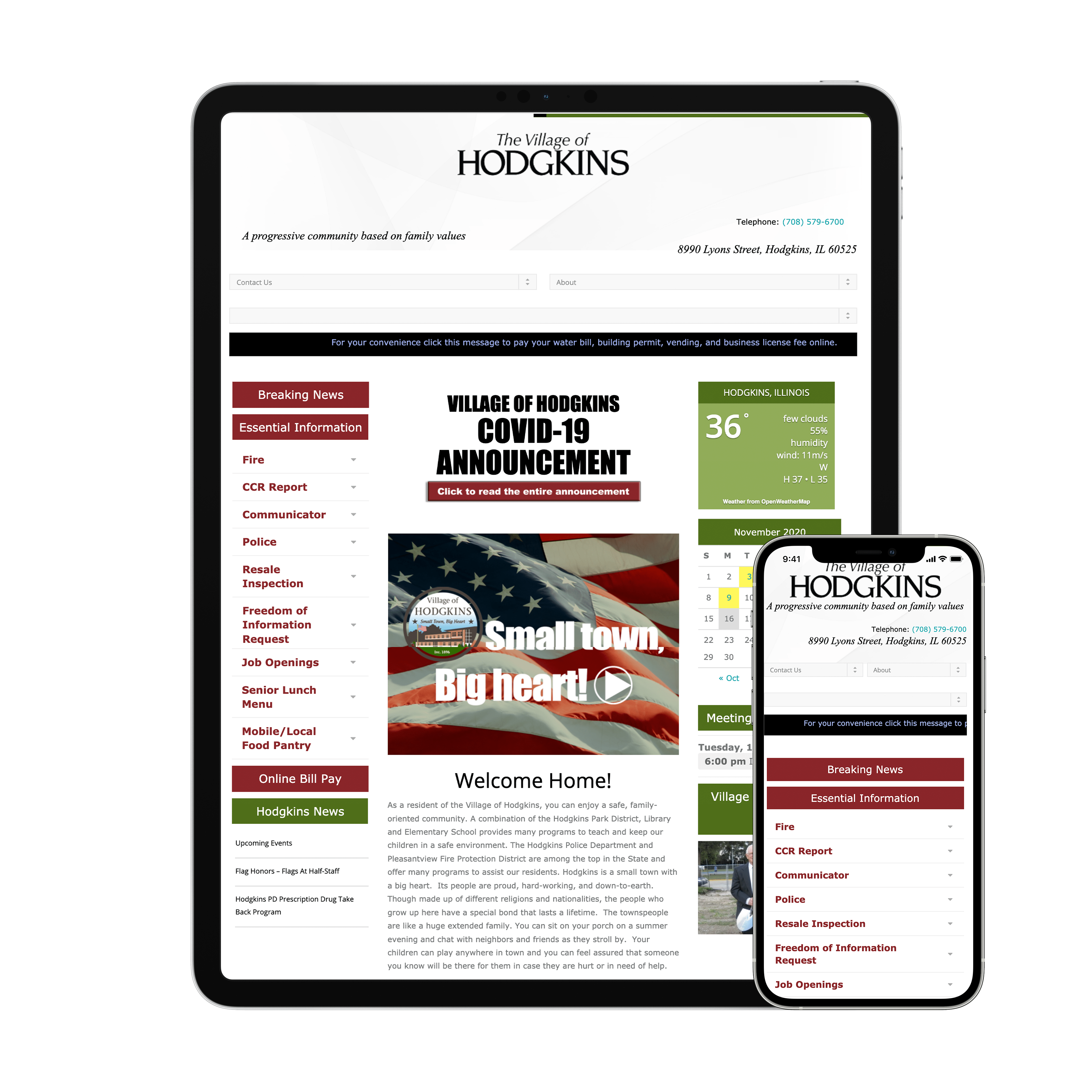 Responsive website, graphic design, many pages of content for Village of Hodgkins website.